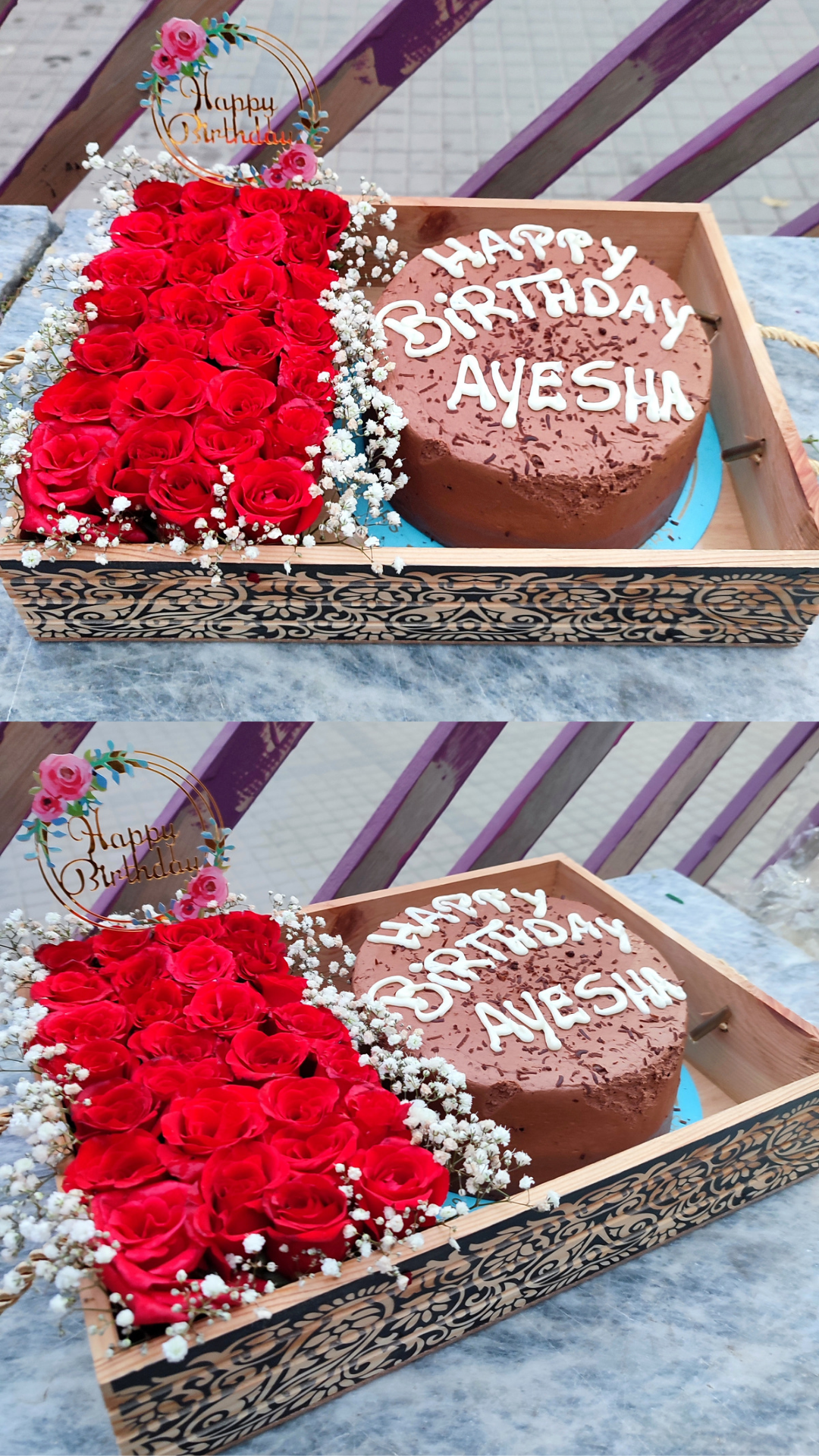 A Wooden Tray with Layers’ German Fudge Cake and a Floral Arrangement including a cake topper and a card as per occasion